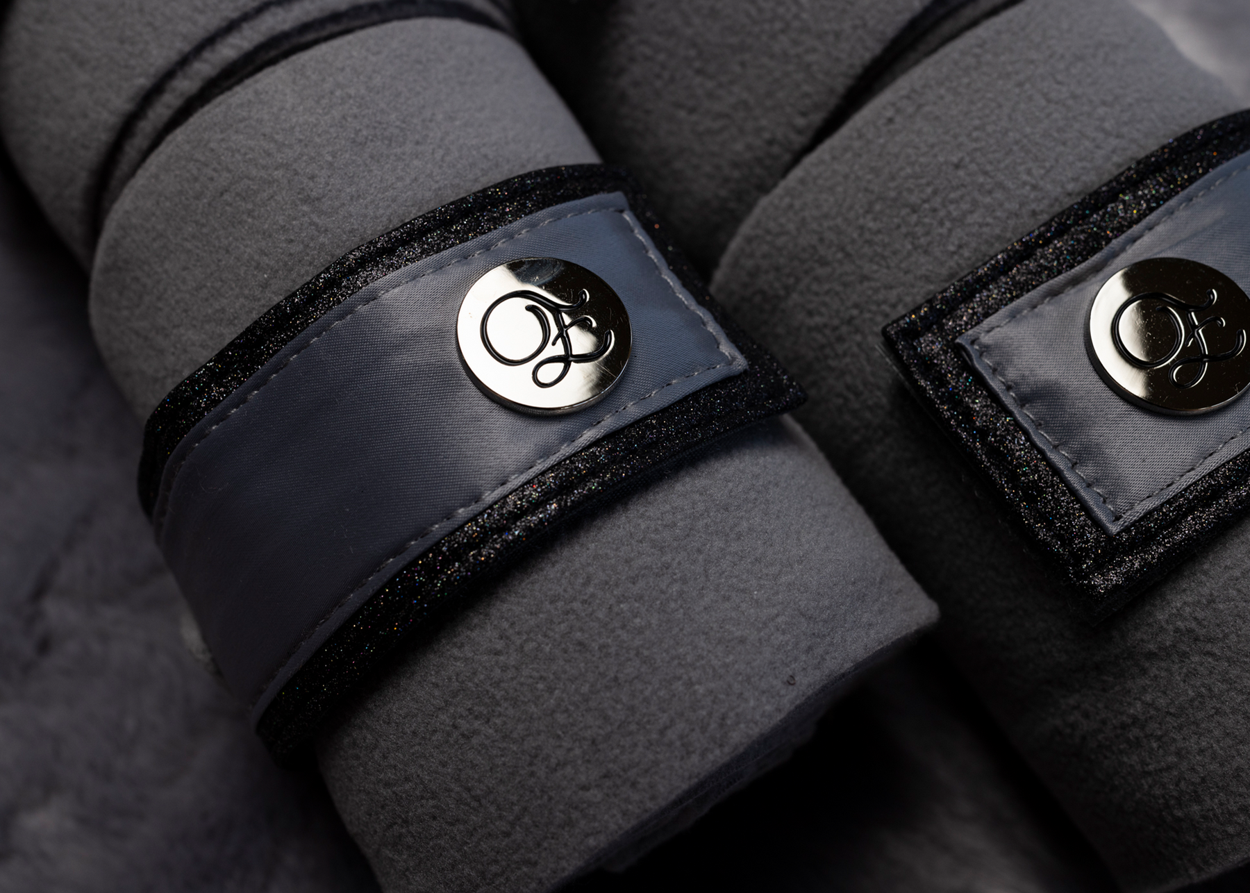 High quality grey polo wraps with dual satin tabs and metal logo plate.