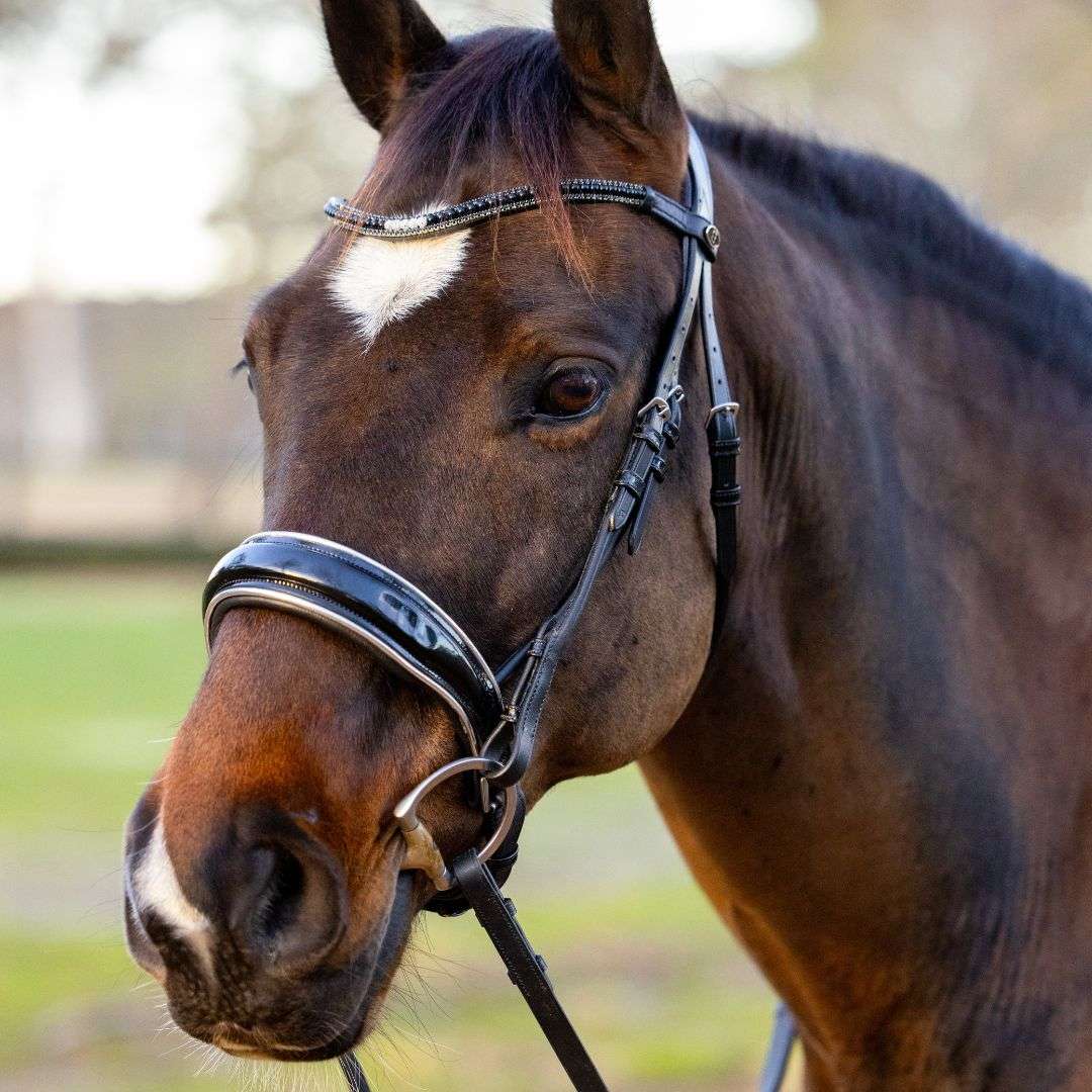 Black patent leather cavesson noseband with silver piping, hand crafted with soft leather that has been carefully shaped to contour around the horse’s nose and cheekbones for comfort. Crank pad closure for dispersed pressure across the noseband. Can be used for a snaffle or double bridle.