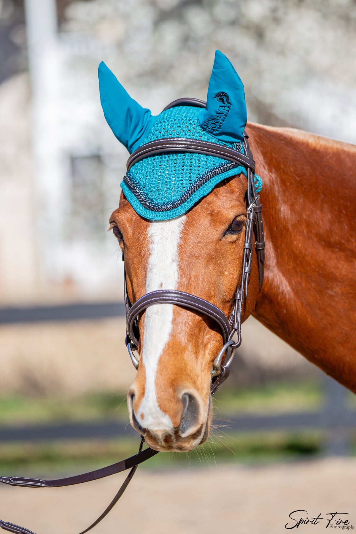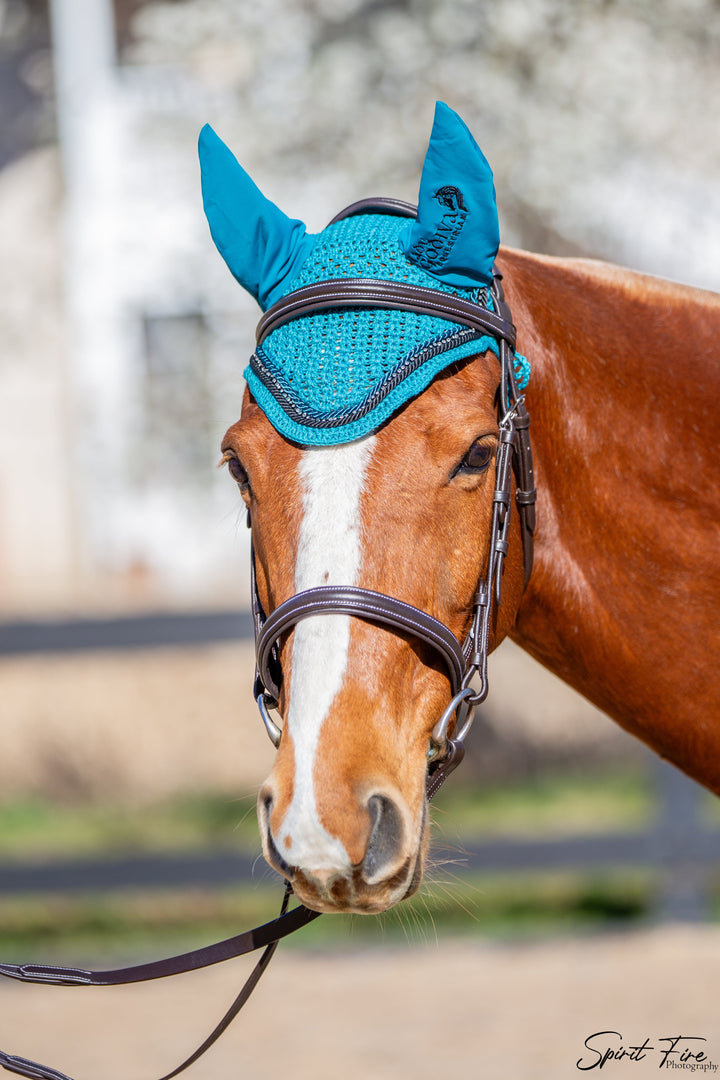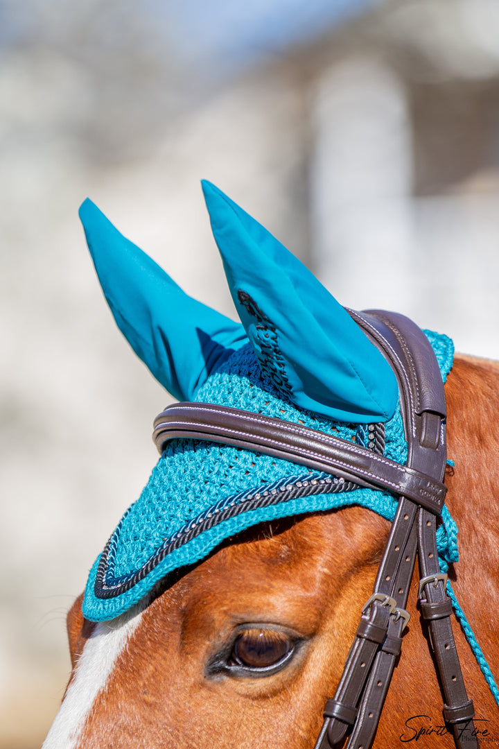 - घोड़े की पूंछ पर असुविधा से बचने के लिए हेडपीस के शीर्ष पर हटाने योग्य नाकबैंड का पट्टा लगाया जाता है।