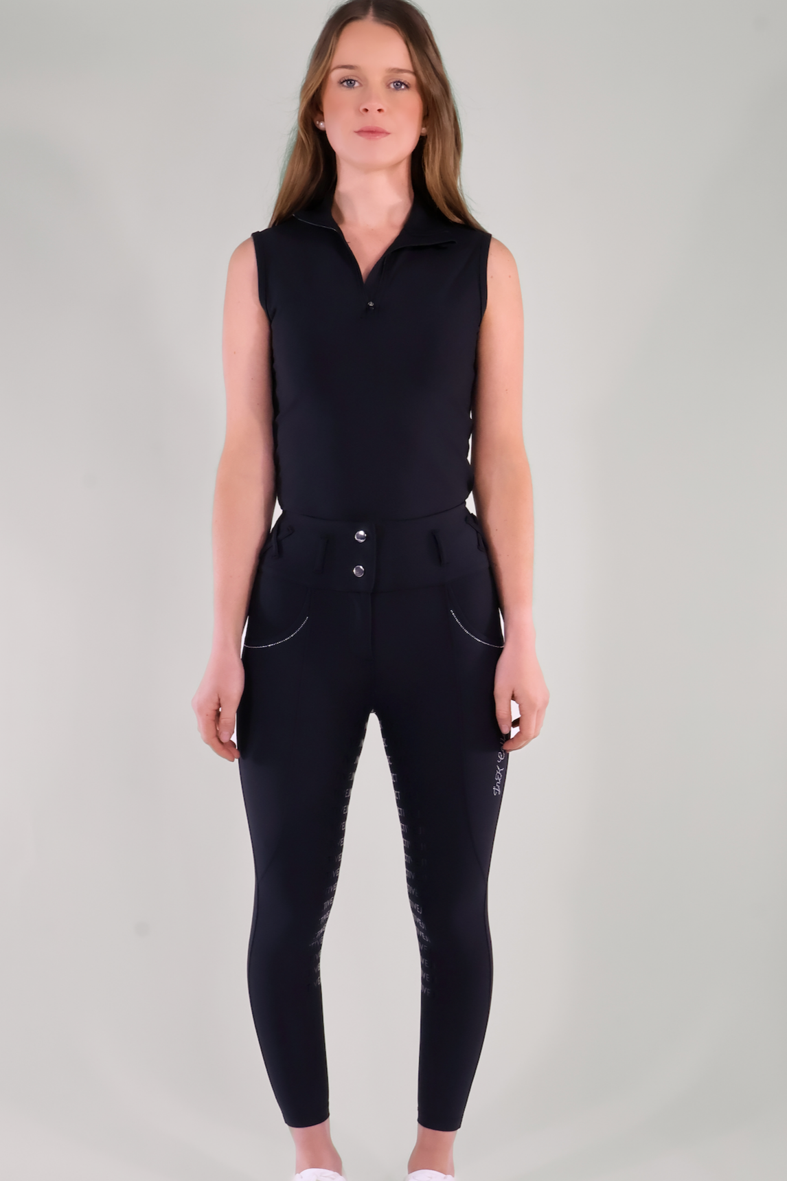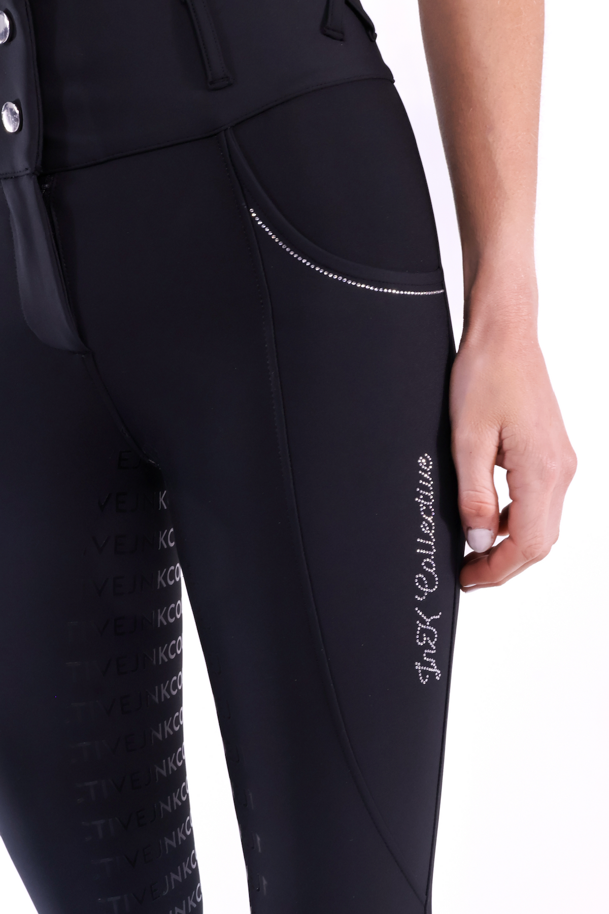 Elevate your equestrian style with our Diamond Hybrid Tights. Featuring a seamless gel seat for comfort, secure silicone grip, and strategically placed belt loops. Quick-drying, moisture-wicking, and four-way stretch fabric keep you cool and comfortable. Two leg and one back phone pocket with zip provide convenient storage. Non-see-through with double stitching for durability. Finished with our signature black back logo and "JNK COLLECTIVE" in sparkling diamonds.