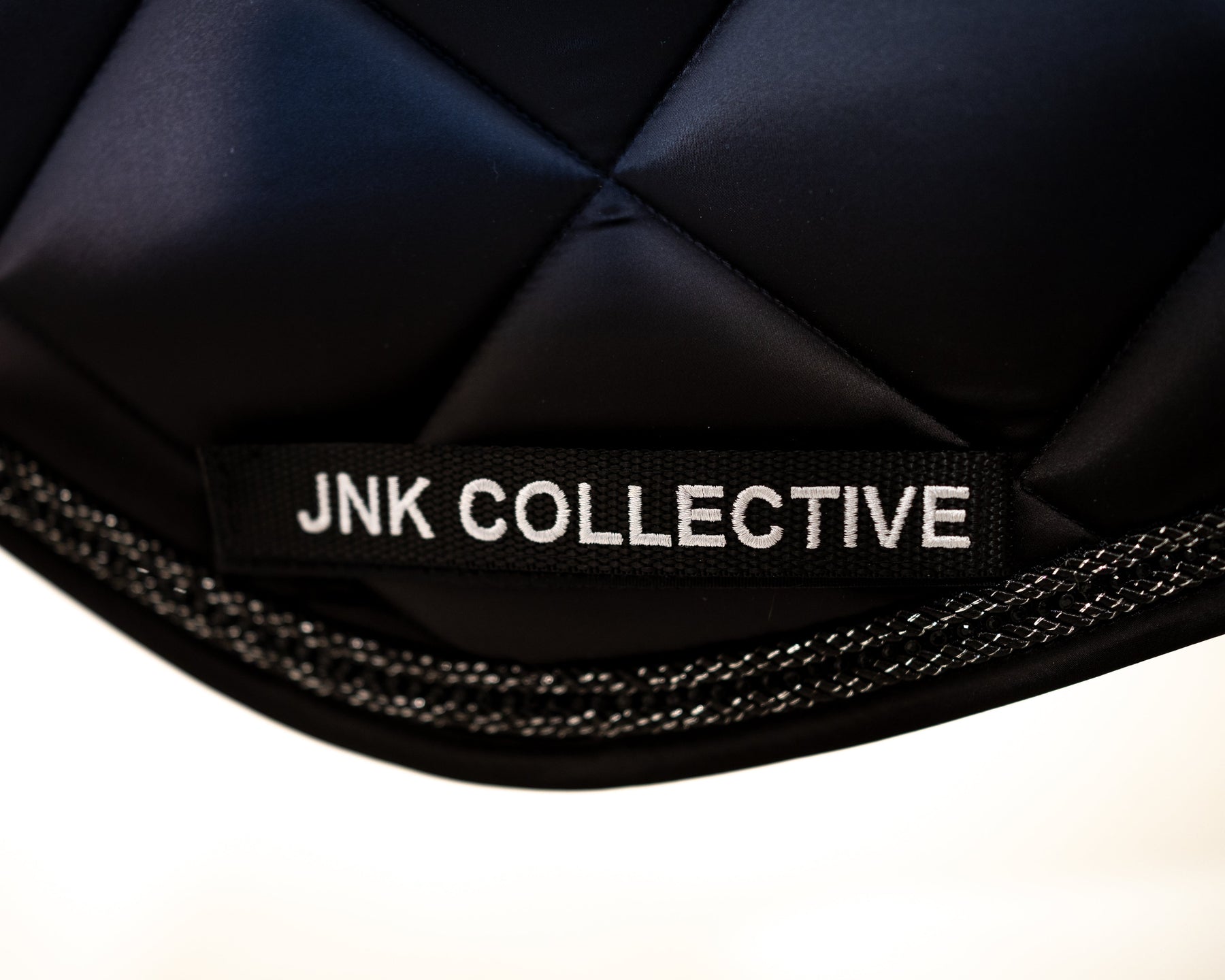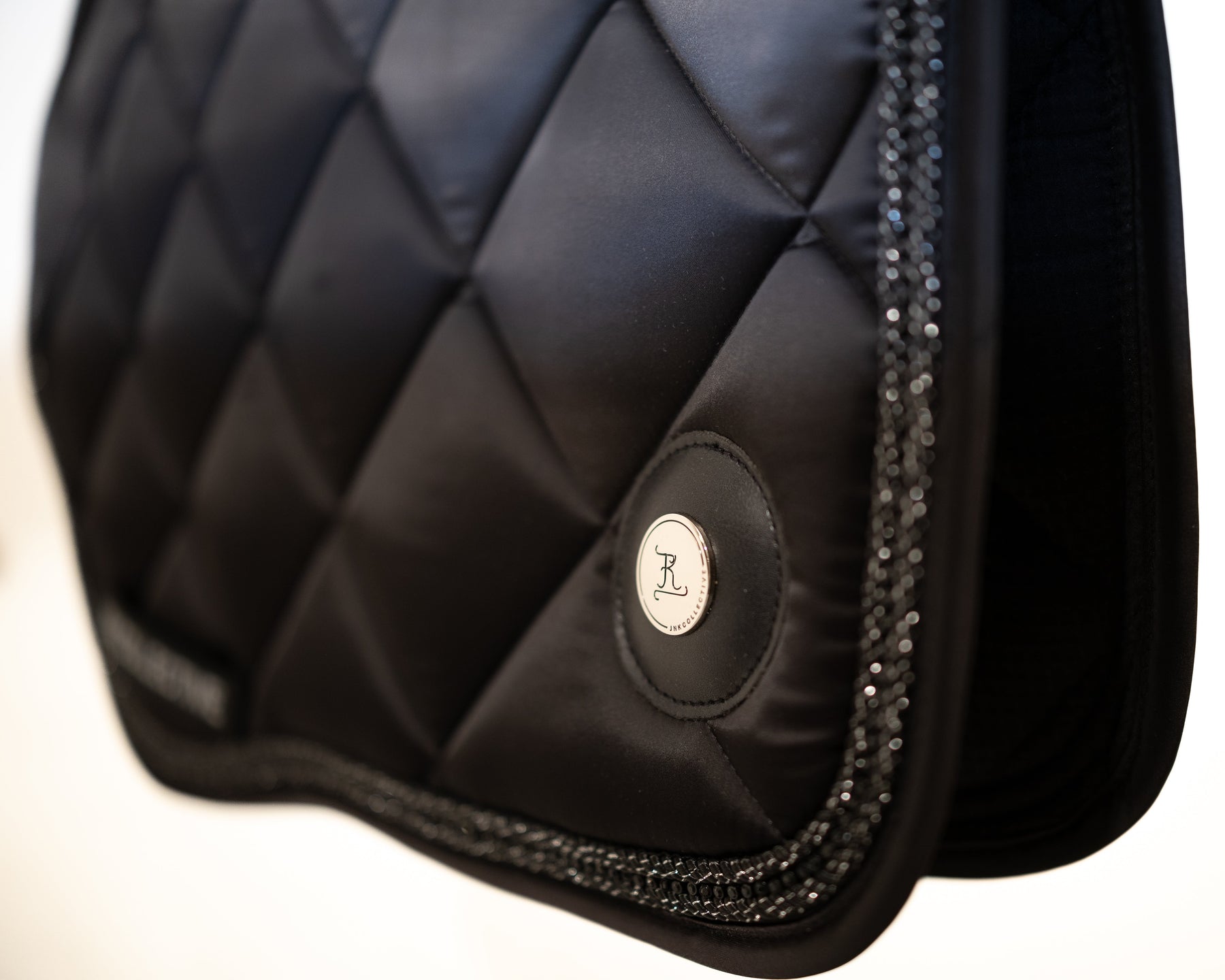 This exquisite Black Crystal Saddle Pad- Jump combines beauty and function. Its diamond quilting and black ropes adorned with a crystal chain add an elegant touch, while velcro tabs and a non-slip cushion provide comfort and stability for your horse. Made with waffle cotton, this pad is quick-drying, breathable, moisture-wicking, and anti-bacterial. Ride in style and luxury with this premium saddle pad.